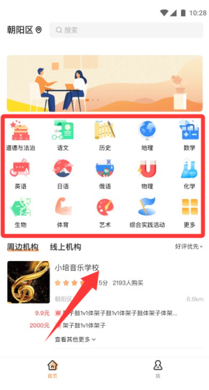 2、在選課中心根據(jù)學(xué)科或距離篩選機(jī)構(gòu),查看推薦列表的師資和課程詳情,支持直接購買線上或線下課程。